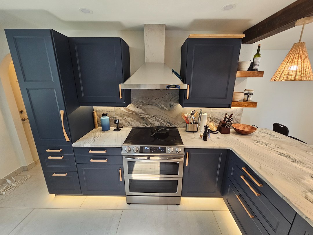 The kitchen feature sleek quartz countertops. Quartz offered the homeowners a durable, low-maintenance surface that fits the modern aesthetic they wanted. We measured and installed the countertops to align with the cabinetry and plumbing layouts, ensuring a precise fit and an easy-to-clean finish for everyday use.