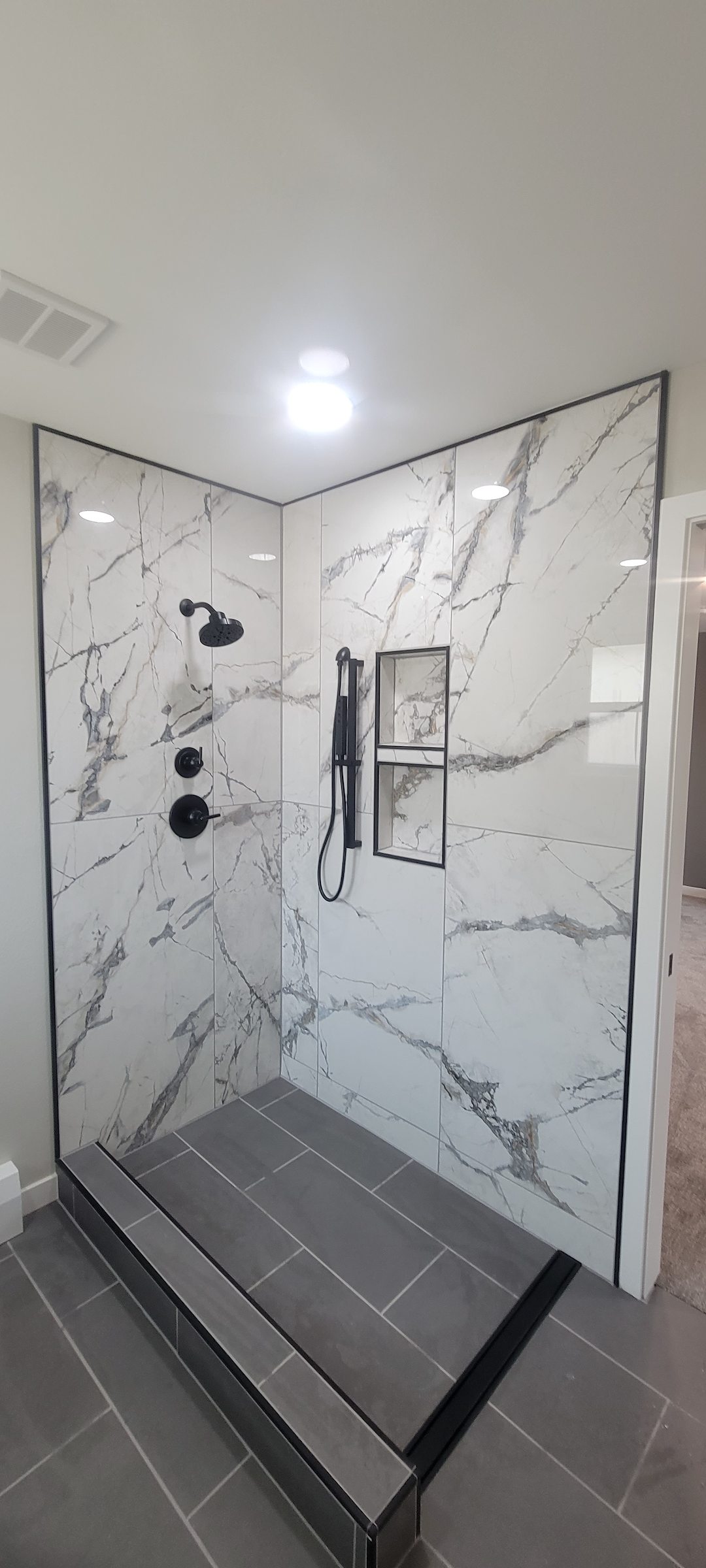 Linear drain, Custom tiled shower pan, Porcelain and Ceramic Tile, Custom bath Vanity, Natural Stone Granite/Marble, Large format tile, Shower glass door, Led lighting , Cabinetry, Paint, Drywall/Gypsum BoardClient Review