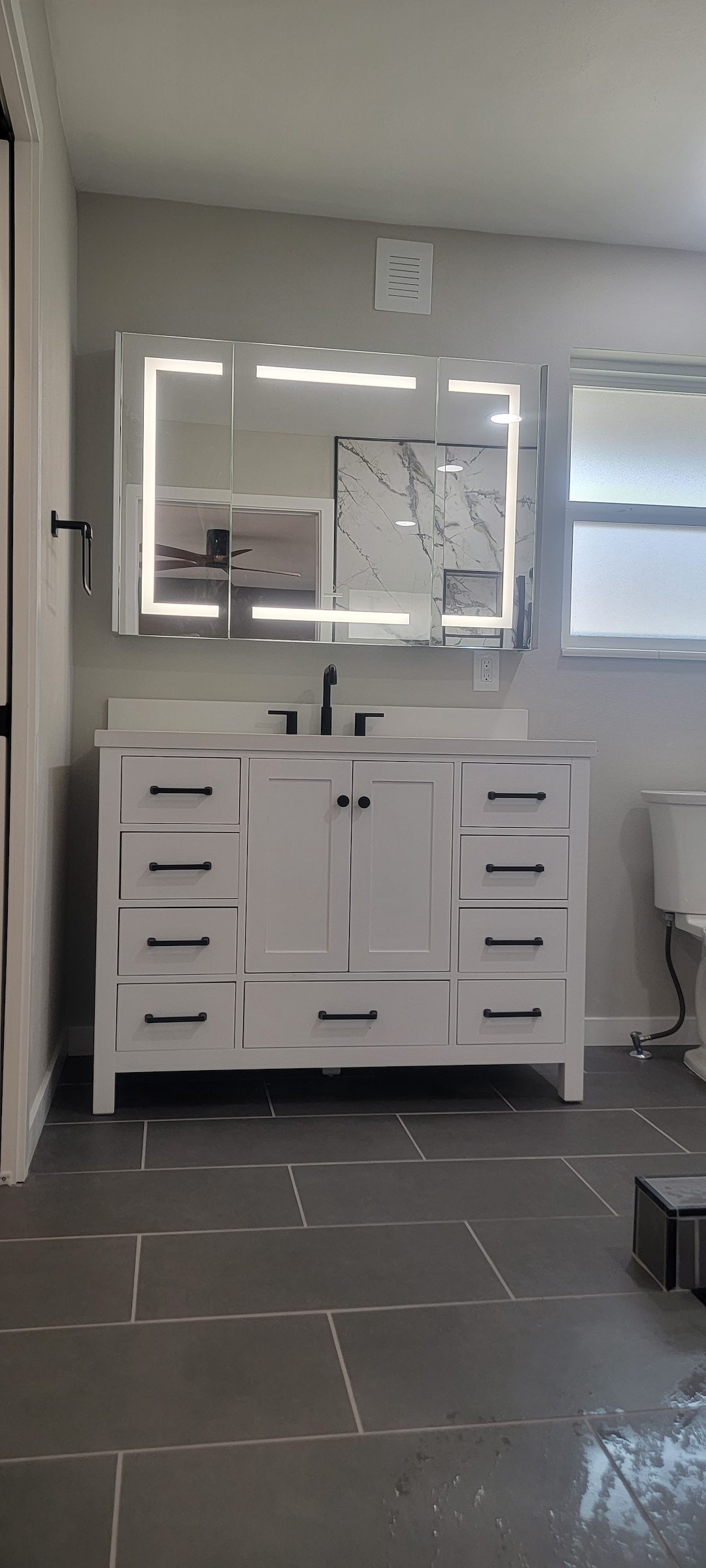We paired the tile work with a new premium vanity that provides both style and practical storage. High-end fixtures and matching accessories were selected to complete the aesthetic and deliver a consistent finish across all touchpoints. These details help create the intended spa-like atmosphere without sacrificing durability or everyday function.