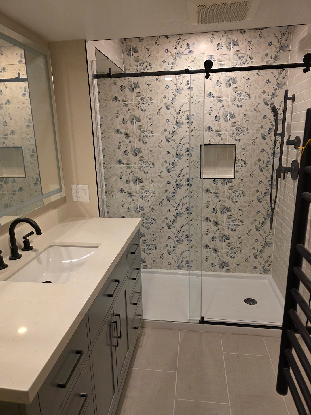 In the bathroom, the space was completely reimagined into something calm and refined. A frameless glass shower with matte black hardware keeps the look simple and open, while the full-height patterned tile adds just enough character without overwhelming the room. The custom vanity, quartz countertops, and soft, neutral tones tie everything together for a clean, timeless finish.