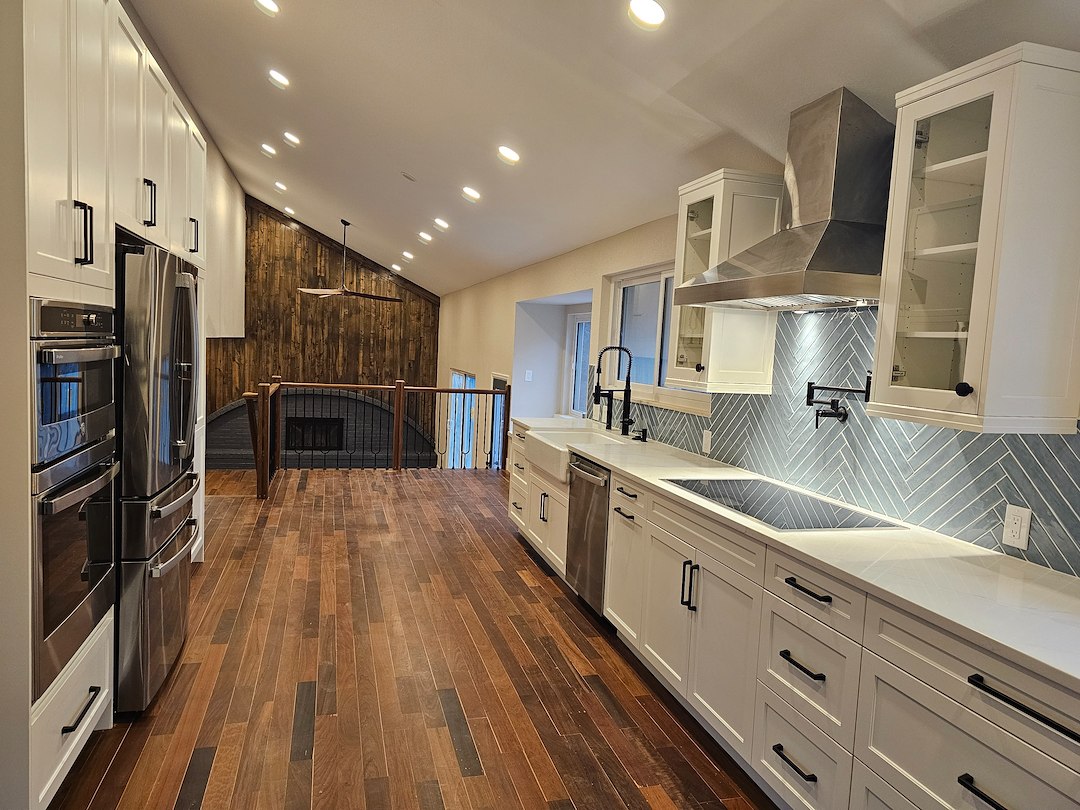 The kitchen remodel anchors the home. Custom cabinetry, quartz countertops, and a farmhouse sink create a classic foundation, while the herringbone tile backsplash and black fixtures bring in a more modern edge. High-end appliances are seamlessly integrated, and the layout was opened up to improve flow, making the space feel brighter and more connected.